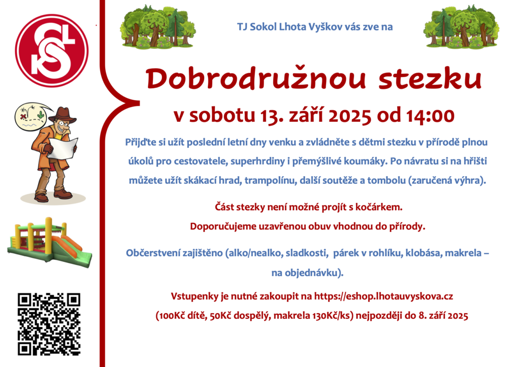 Vstupenky je nutné zakoupit na e-shopu – https://eshop.lhotauvyskova.cz/dobrodruzna-stezka-2025/ . Chtěl bych vás požádat o uvedení jména dítěte do pole Poznámka pro prodejce – usnadní nám to vystavení účastnických kartiček a urychlí tak vstup na akci. Děkuji za pochopení.